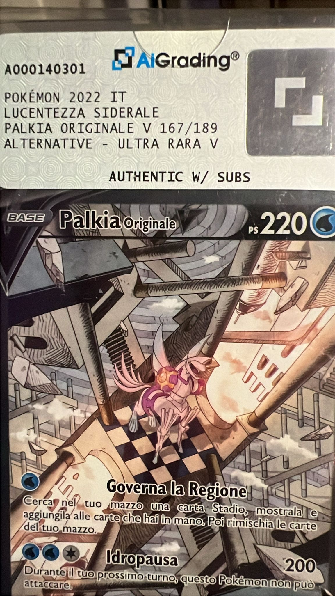 Carta del gioco di carte collezionabili Pokémon, edizione italiana del set 'Lucentezza Siderale' (corrispondente ad 'Astral Radiance' in inglese). Prodotta nel 2022. La carta è stata certificata come autentica dal servizio AI Grading e sigillata in una custodia protettiva rigida. L'illustrazione è una 'Alternate Art' (arte alternativa) di Palkia nella sua forma originale, disegnata da Oswaldo Kato.