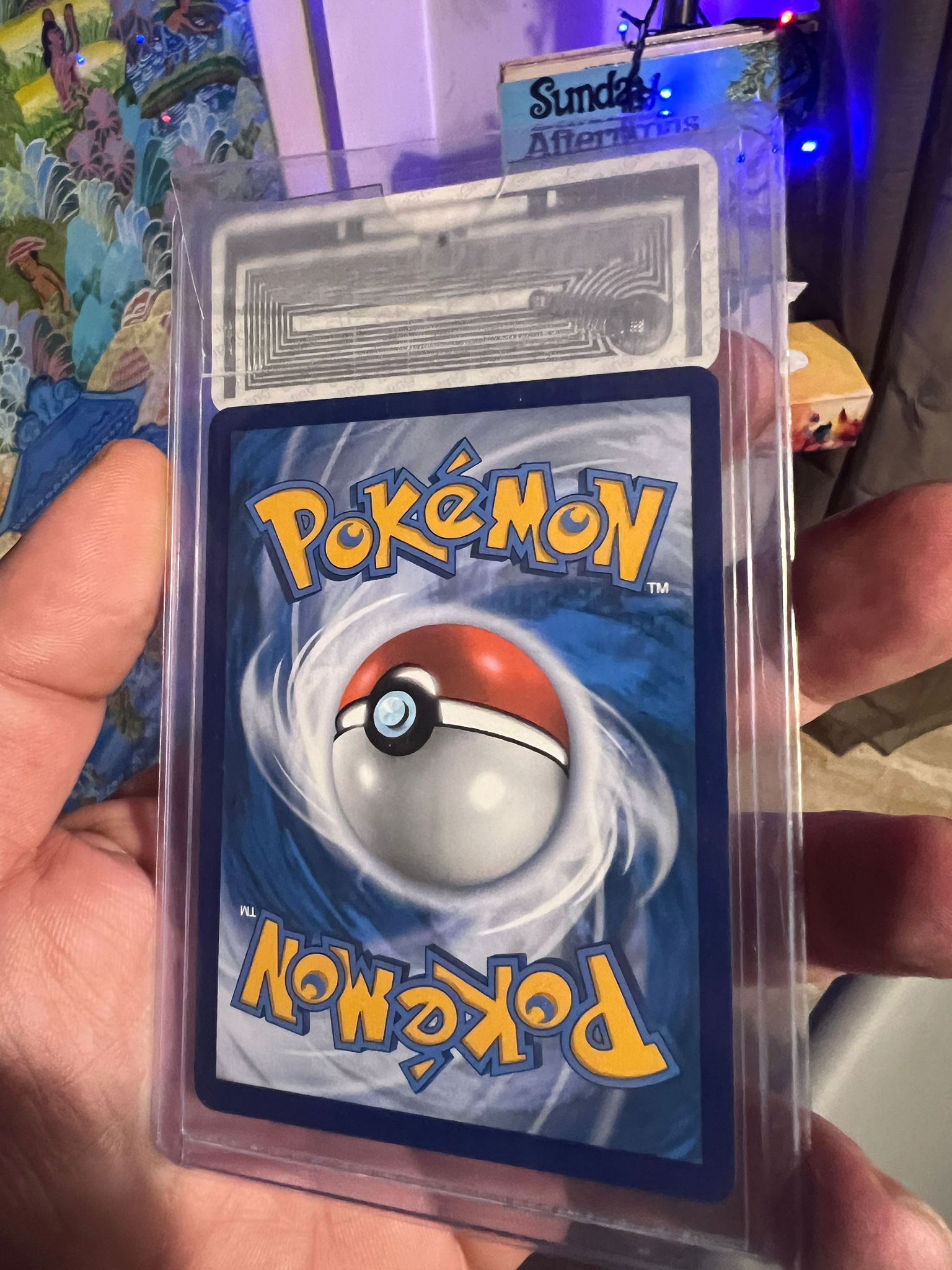 La carta Pokémon e la sua custodia protettiva rigida sono in condizioni eccellenti. La carta appare immacolata, senza segni di usura, pieghe o imperfezioni visibili. L'effetto foil è brillante e uniforme. La custodia è trasparente e lucida, senza graffi significativi. Un sottile filamento esterno è visibile sulla superficie della custodia in alcune foto, ma non è un difetto dell'oggetto.