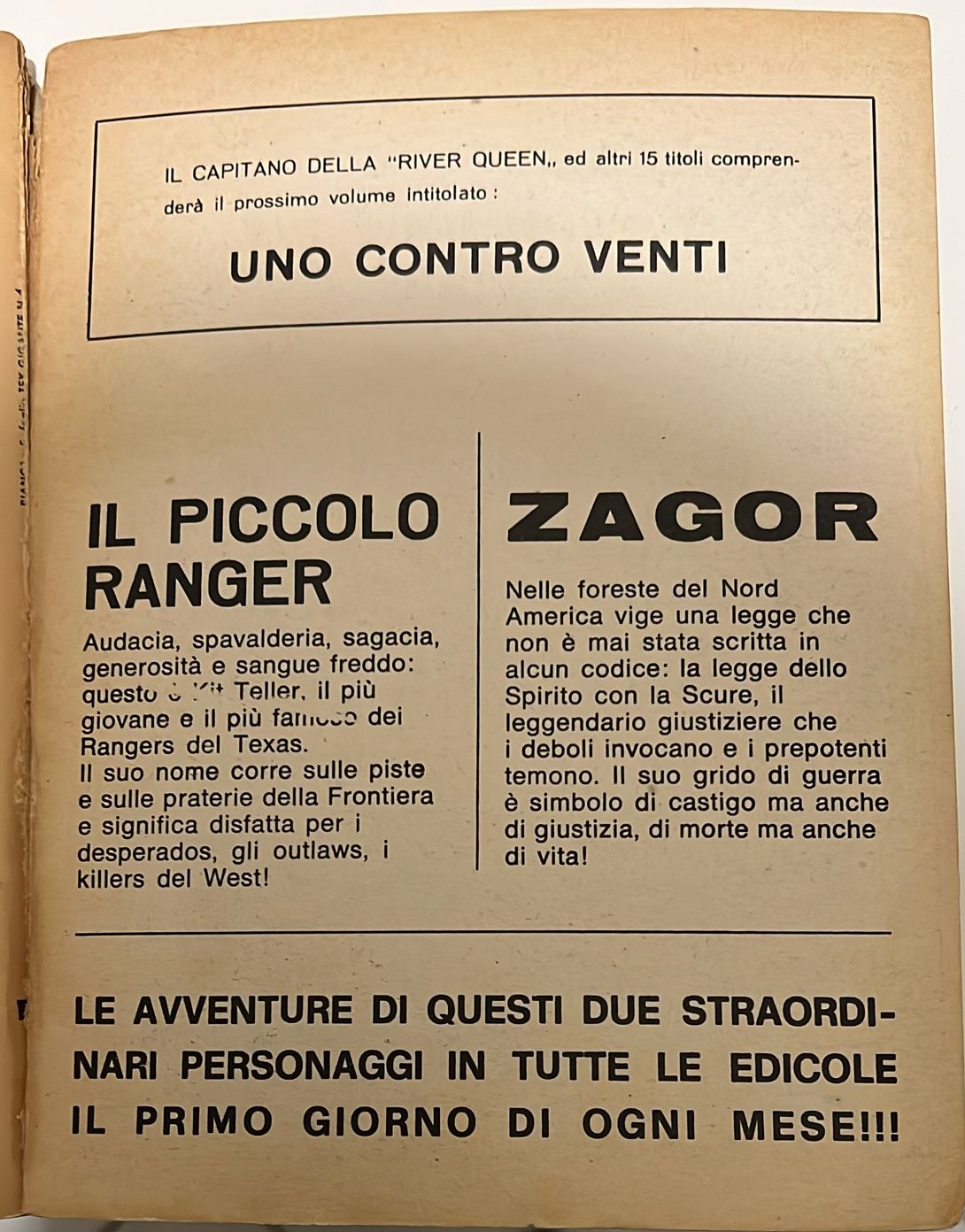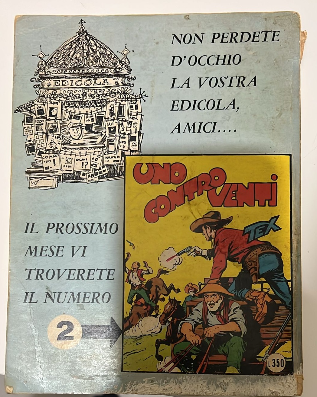 Si tratta del nostro fumetto d'epoca, con una copertina illustrata a colori vivaci che raffigura scene d'azione. I materiali visibili sono principalmente della carta stampata. Lo stile artistico e le illustrazioni di genere western suggeriscono l'appartenenza dell'oggetto all'epoca del fumetto classico italiano, probabilmente tra gli anni '60 e '70, come indicato anche dal prezzo in Lire. Le condizioni generali sono dell'usato con evidenti segni del tempo, inclusi angoli piegati e strappati, bordi sfilacciati e generale usura della copertina.L'immagine mostra il dorso del libro, con il titolo La copertina posteriore del volume presenta l'illustrazione dell'edicola con la scritta L'immagine mostra l'apertura del primo numero della L'immagine aggiuntiva presenta una pagina del nostro oggetto, la La pagina ingiallita del fumetto mostra titoli in grassetto e descrizioni dei personaggi. Si notano i dettagli della rilegatura del volume sul bordo sinistro. La finitura della carta è opaca, con l'inchiostro nero del testo ben conservato, tipico dell'editoria dell'epoca.