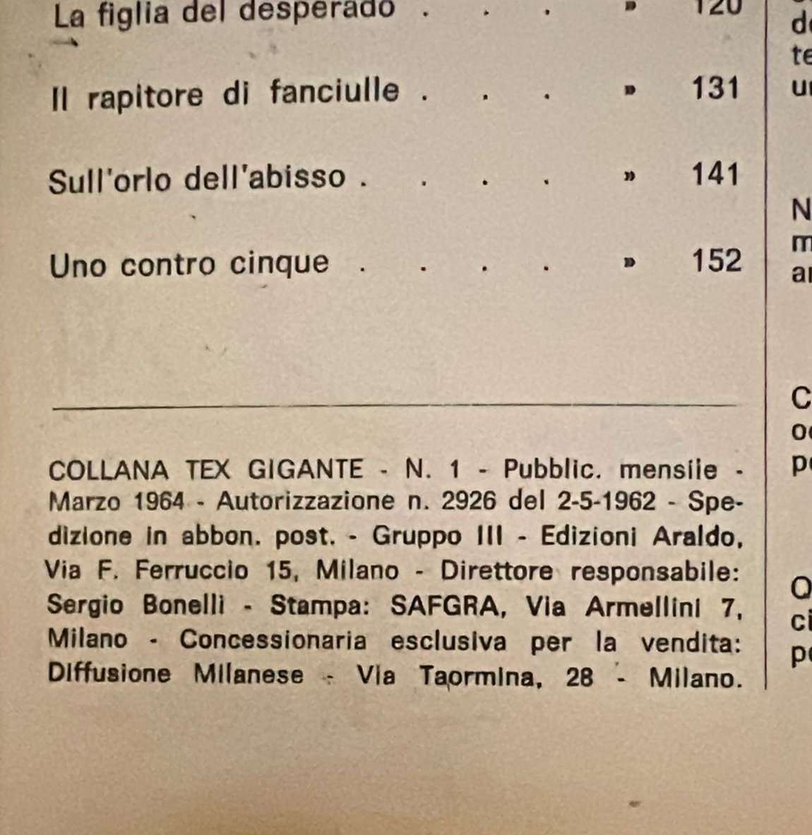 Prodotto e pubblicato in Italia, Milano, nel Marzo 1964. Rappresenta il debutto della storica collana 'Tex Gigante' e include dettagli editoriali con Sergio Bonelli come direttore responsabile. Riflette il contesto del fiorente mercato del fumetto western italiano del dopoguerra.