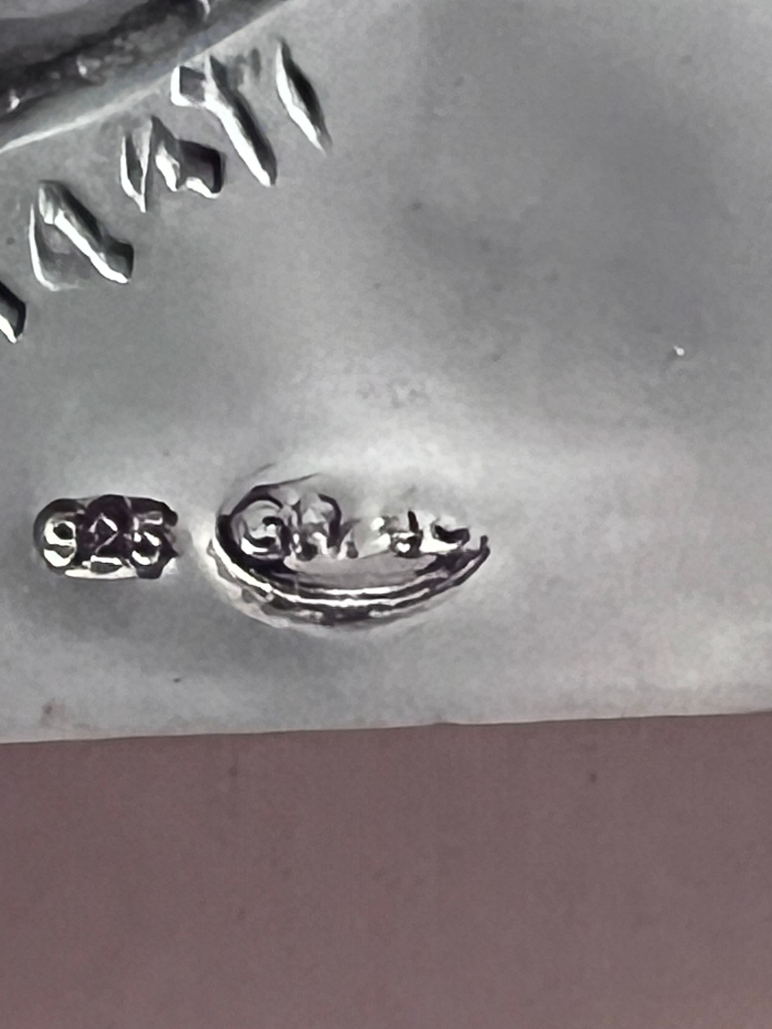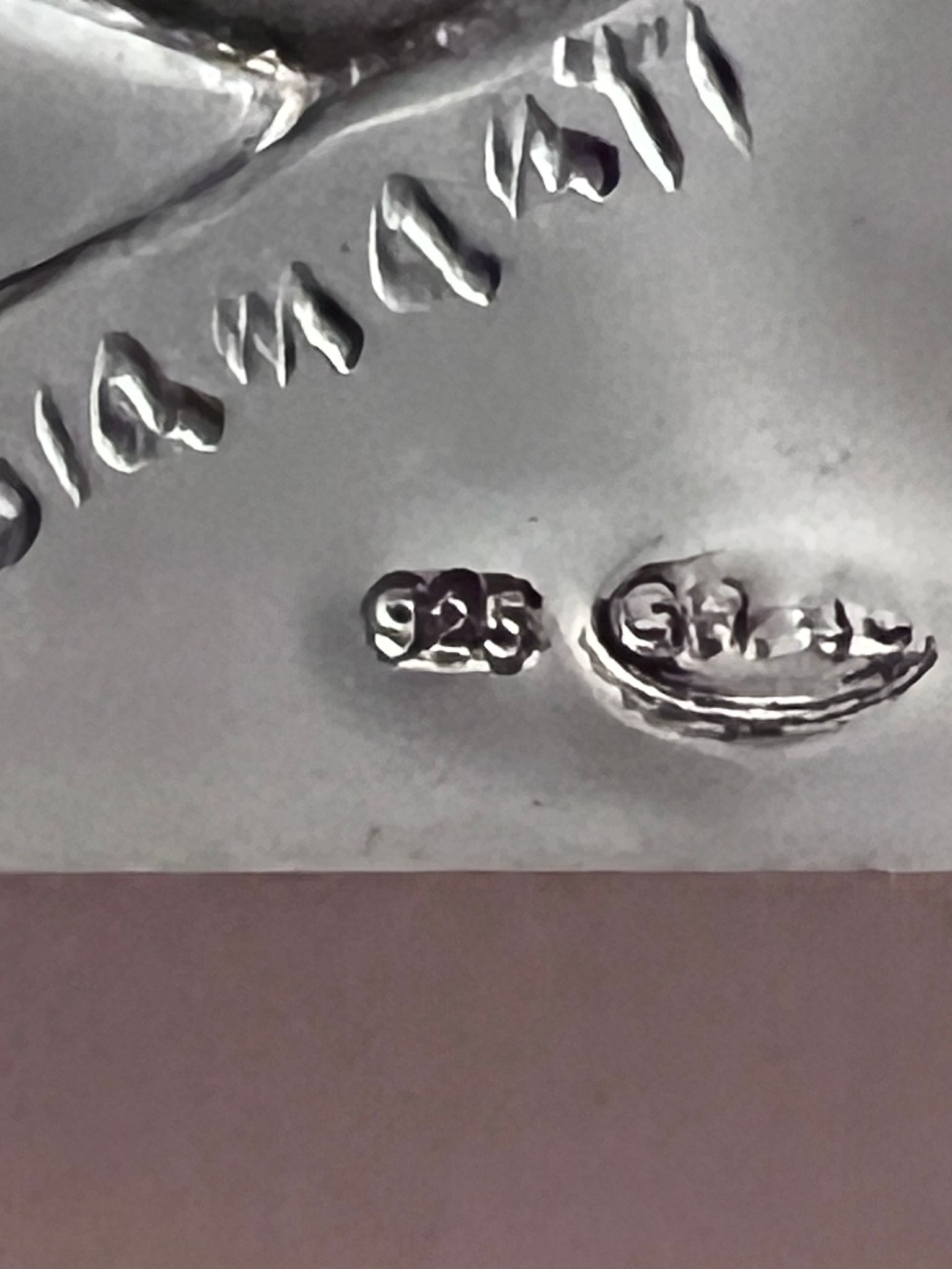 Questo raffinato pannello decorativo presenta un bassorilievo in argento Sterling 925, arricchito da delicate dorature che ne esaltano i dettagli e la profondità. L'opera raffigura una suggestiva scena di genere ambientata in un caffè, dove tre figure femminili sono intente in conversazione, con un'atmosfera che richiama le vie pittoresche e animate delle città europee. La composizione è ricca di particolari, dalle architetture circostanti con l'insegna 'CAFÉ' agli abiti e agli accessori delle donne, tutti resi con grande maestria e attenzione alla prospettiva e al chiaroscuro. La firma 'Diamanti' è incisa sull'argento, indicando l'autore dell'opera, mentre il punzone '925' ne attesta la purezza dell'argento. Accanto, il marchio 'GR. 48' identifica la manifattura o l'argentiere italiano iscritto nel registro di Grosseto. La cornice in legno, con il suo profilo dorato interno, completa l'opera, conferendole una presentazione elegante e pronta per essere esposta. Quest'oggetto è un esempio pregevole dell'artigianato argentiere italiano, combinando la ricchezza del metallo prezioso con una narrazione visiva coinvolgente.