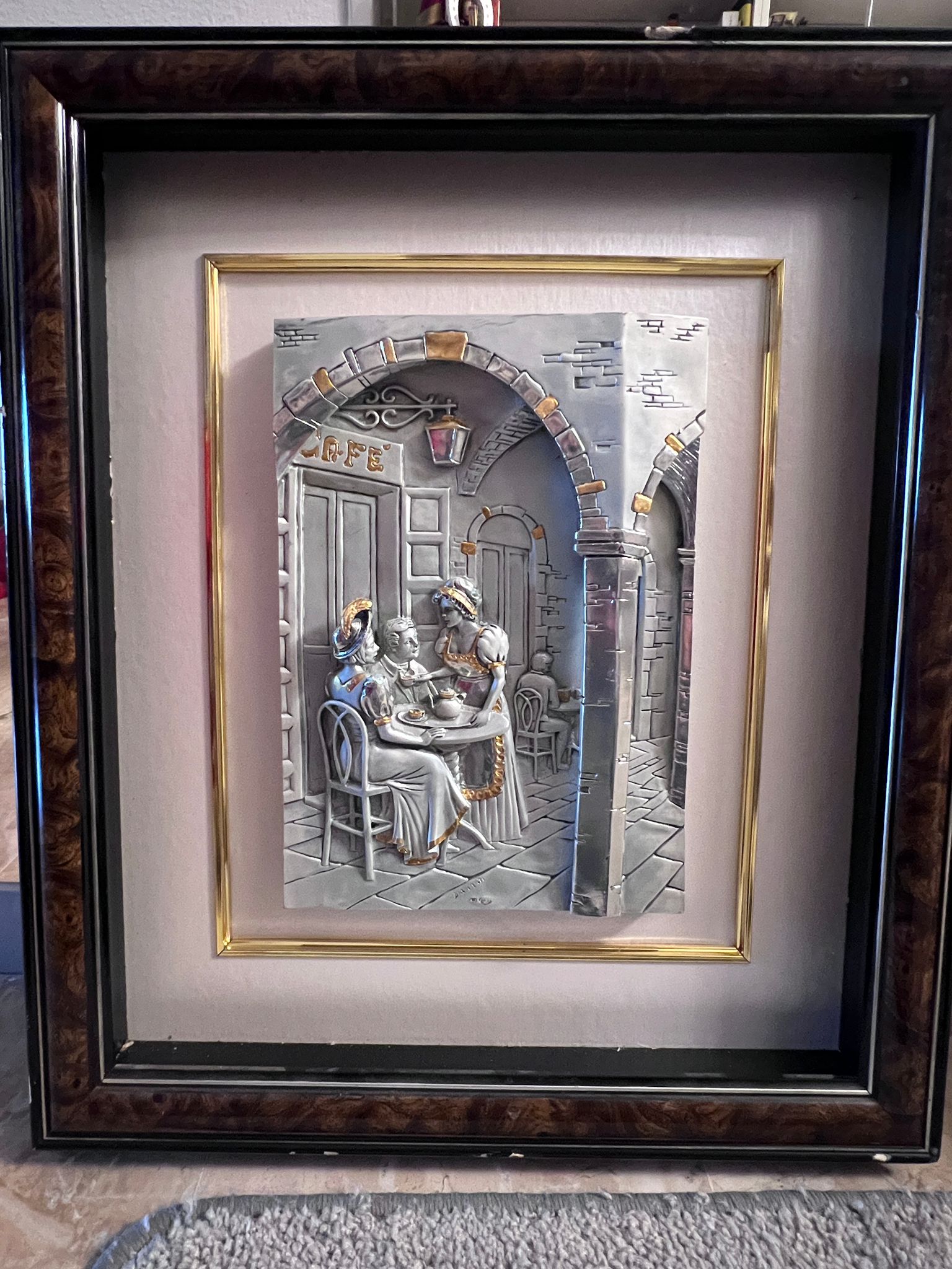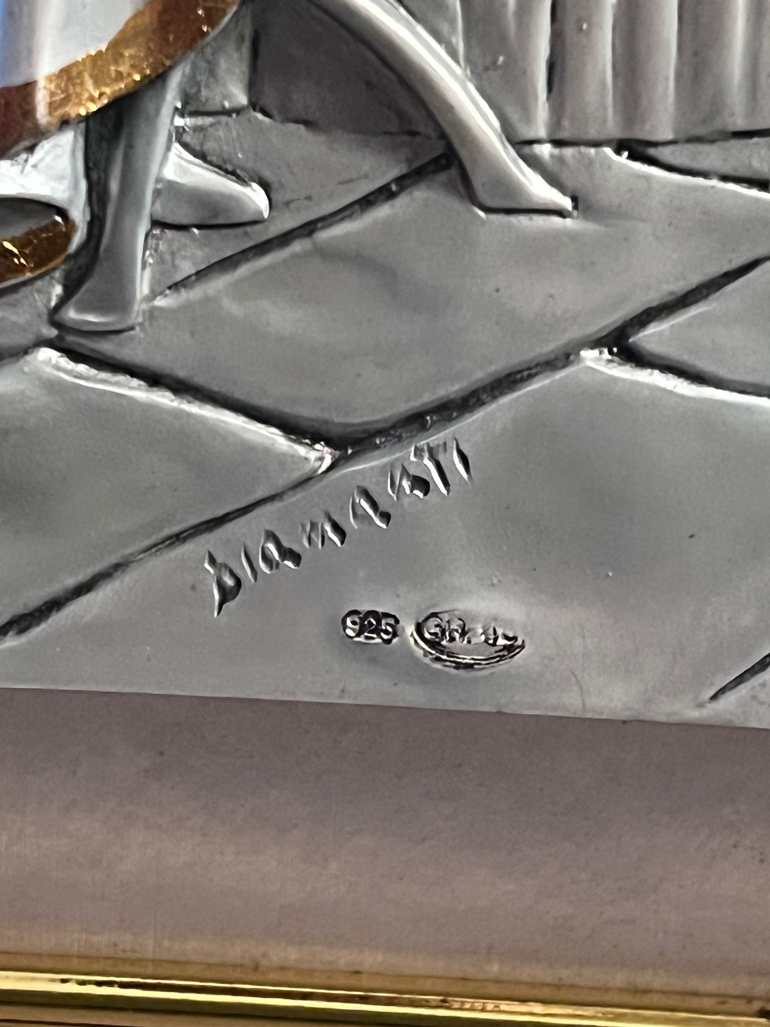 L'opera è di chiara provenienza italiana, come attestato dai punzoni '925' e 'GR. 48'. Il punzone 'GR. 48' indica il 48° argentiere registrato nella provincia di Grosseto, un sistema di identificazione comune in Italia per le manifatture di metalli preziosi. La firma 'Diamanti' suggerisce l'identità dell'artista o del maestro orafo che ha realizzato o disegnato il rilievo. Molte botteghe argentiere italiane, specialmente tra la fine del XX e l'inizio del XXI secolo, si sono dedicate alla produzione di pannelli decorativi e oggetti d'arte in argento, spesso con soggetti figurativi e dettagli dorati, destinati a un pubblico che apprezzava l'artigianato di lusso e i doni pregiati. Questo tipo di opere era popolare come elemento d'arredo per case signorili o come regali commemorativi. La scena del 'Café' rientra in un genere romantico e nostalgico, evocando un'atmosfera di vita quotidiana europea, molto apprezzata nel design d'interni di quel periodo. L'abilità nella lavorazione dell'argento, unita alla cura dei dettagli e alla combinazione con elementi dorati, rende questo pannello un esempio significativo della tradizione argenteria italiana.