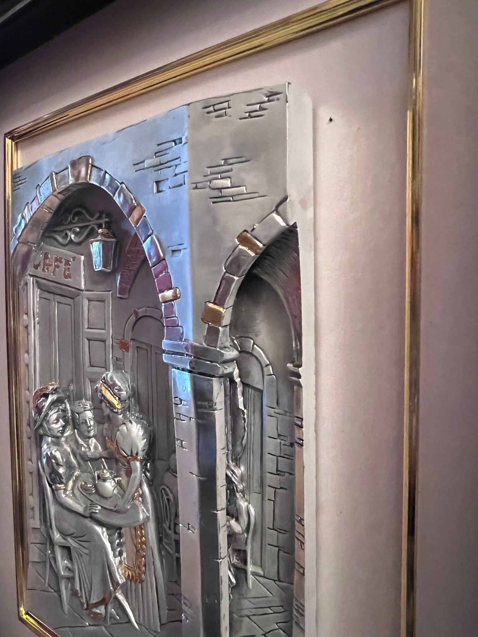 GR. 48 (Grosseto) / Diamanti (artista) Scena di Genere 'Café' (Fine XX secolo - Inizi XXI secolo (circa 1980-2000)) - Splendido pannello decorativo a rilievo in argento Sterling 925 e dettagli dorati, raffigurante una vivace scena di caffè con figure femminili. Firmato dall'artista 'Diamanti' e re